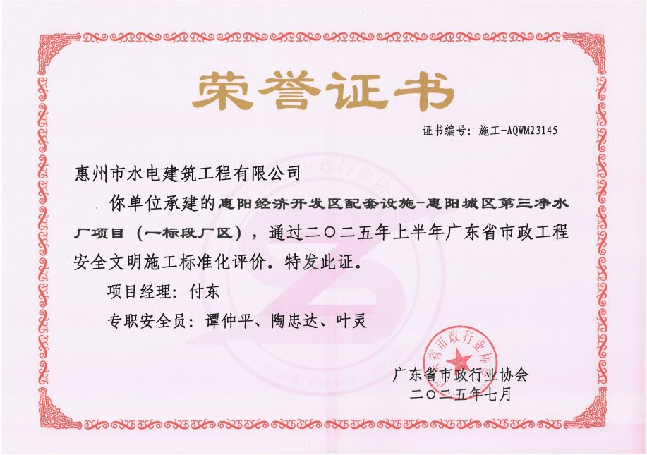 惠州市水電建筑工程有限公司成立于一九六四年四月,隸屬惠州市水務集團有限公司,是一家國有綜合性施工企業(yè),主營水利水電工程、房屋建筑、市政工程等施工業(yè)務。公司擁有水利水電工程施工總承包一級、建筑工程施工總承包一級、市政公用工程施工總承包一級、公路工程施工總承包三級,公路路基、路面及建筑裝修裝飾專業(yè)承包二級,環(huán)保工程、機電安裝、河湖整治、輸變電工程專業(yè)承包三級等經營資質……