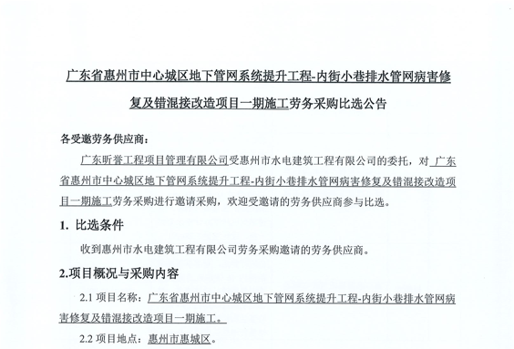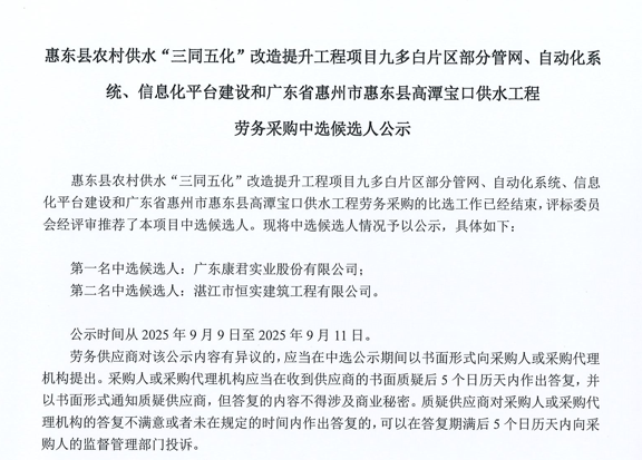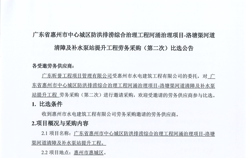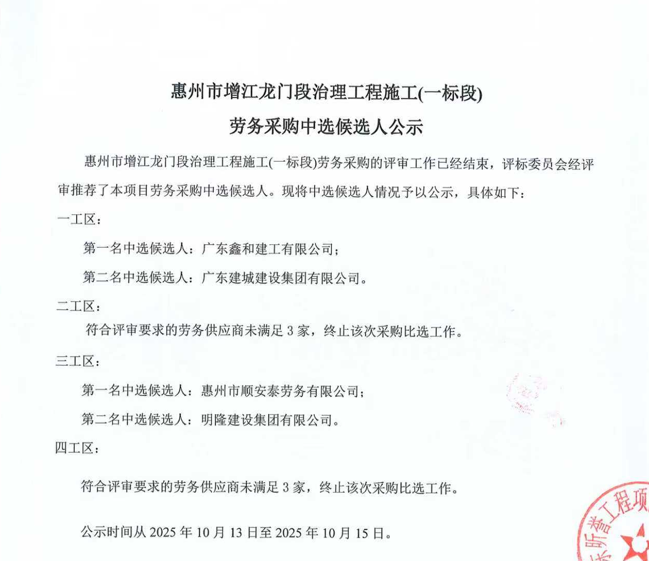 惠州市增江龍門段治理工程施工(一標段)勞務采購中選候選人公示……